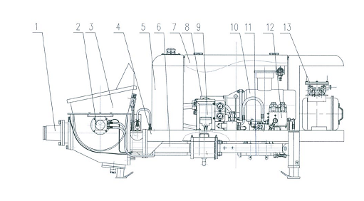 1.出料口 2.攪拌機(jī)構(gòu) 3.料斗 4.機(jī)架 5.液壓油箱 6.泵送系統(tǒng) 7.機(jī)罩總成 8.潤滑系統(tǒng) 9.動(dòng)力系統(tǒng) 10.防暴電動(dòng)機(jī) 11.液壓系統(tǒng) 12.水冷卻部件 13.電器總成